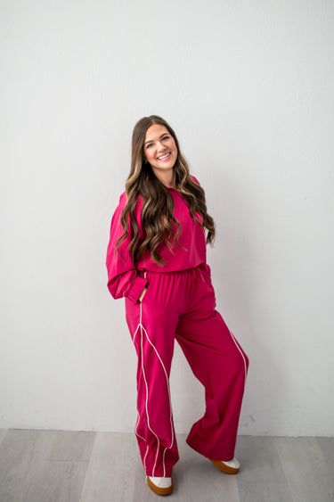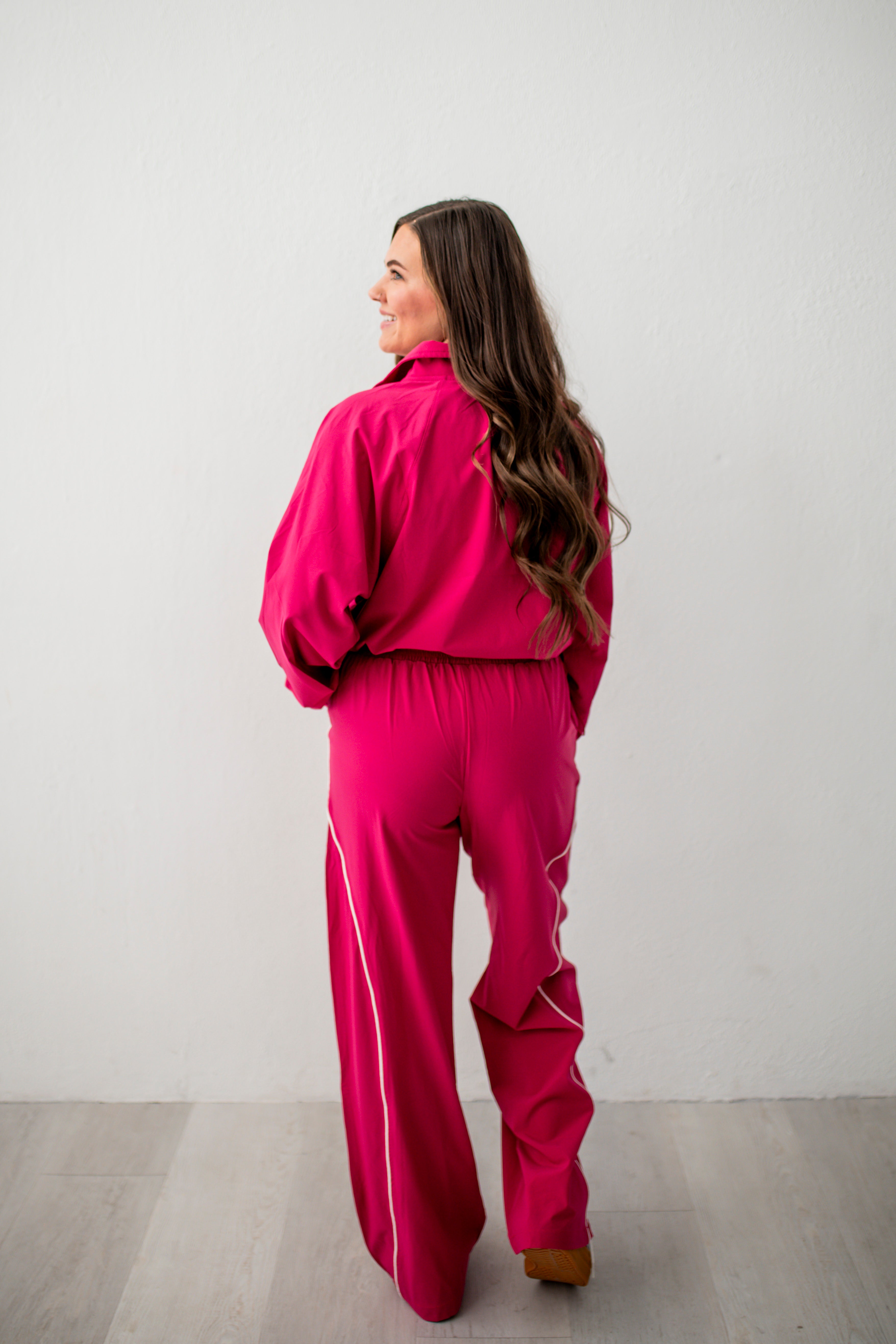 A modern take on the track pant. Crafted from a sleek and lightweight nylon-blend fabric, this wide-leg silhouette features curved contrast piping along the sides, an adjustable toggle waistband, and side pockets. Cool, classic, and effortlessly active.