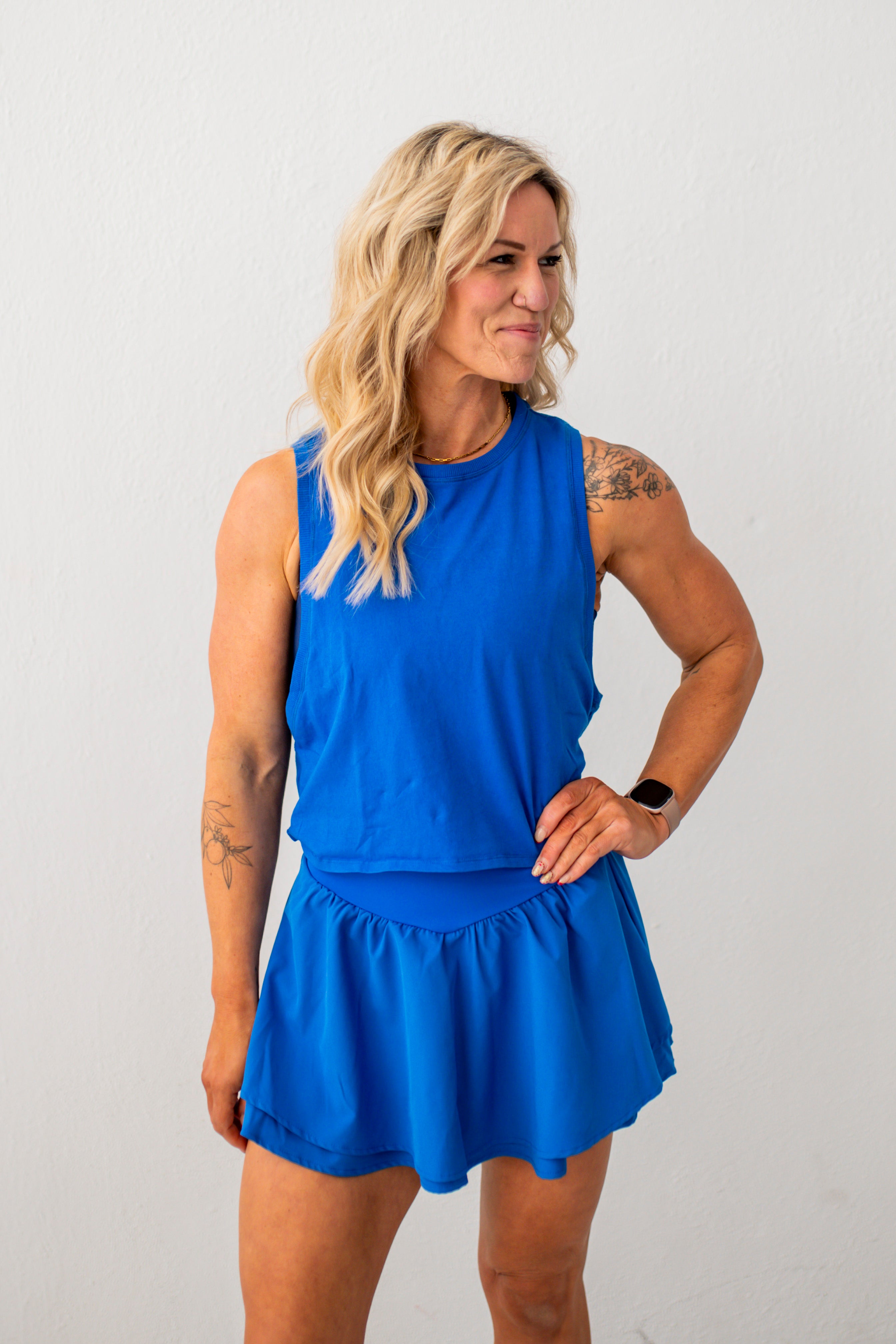 The perfect mix of sporty and cute: a flutter skort with a flattering wide waistband and pocketed inner shorts for easy all-day wear.