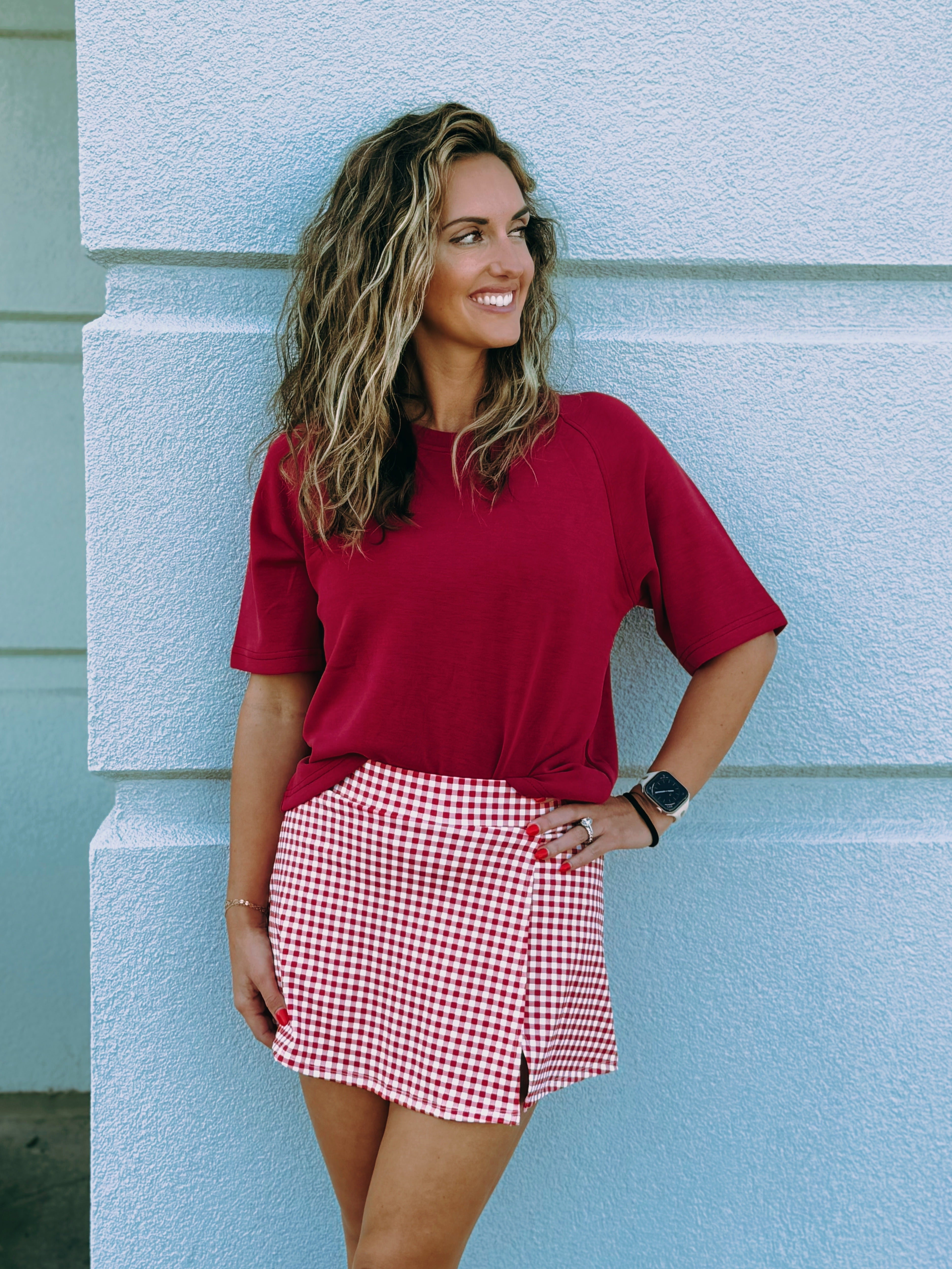 The Red Gingham Print Side Slit A-Line Skort from Little Movements is a flirty take on functional fashion. Designed in a classic gingham print, this A-line silhouette features a playful side slit that reveals built-in shorts for added comfort and coverage. Made from a soft, stretchy blend of 75% nylon and 25% spandex, it moves with you while keeping its shape. Whether you're heading to brunch, a picnic, or a casual day out, this skort effortlessly combines charm and ease for a look that’s both timeless and modern.