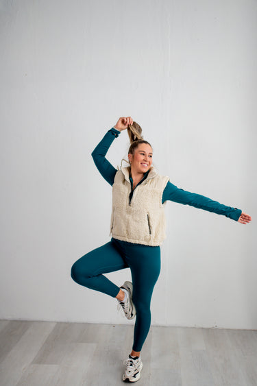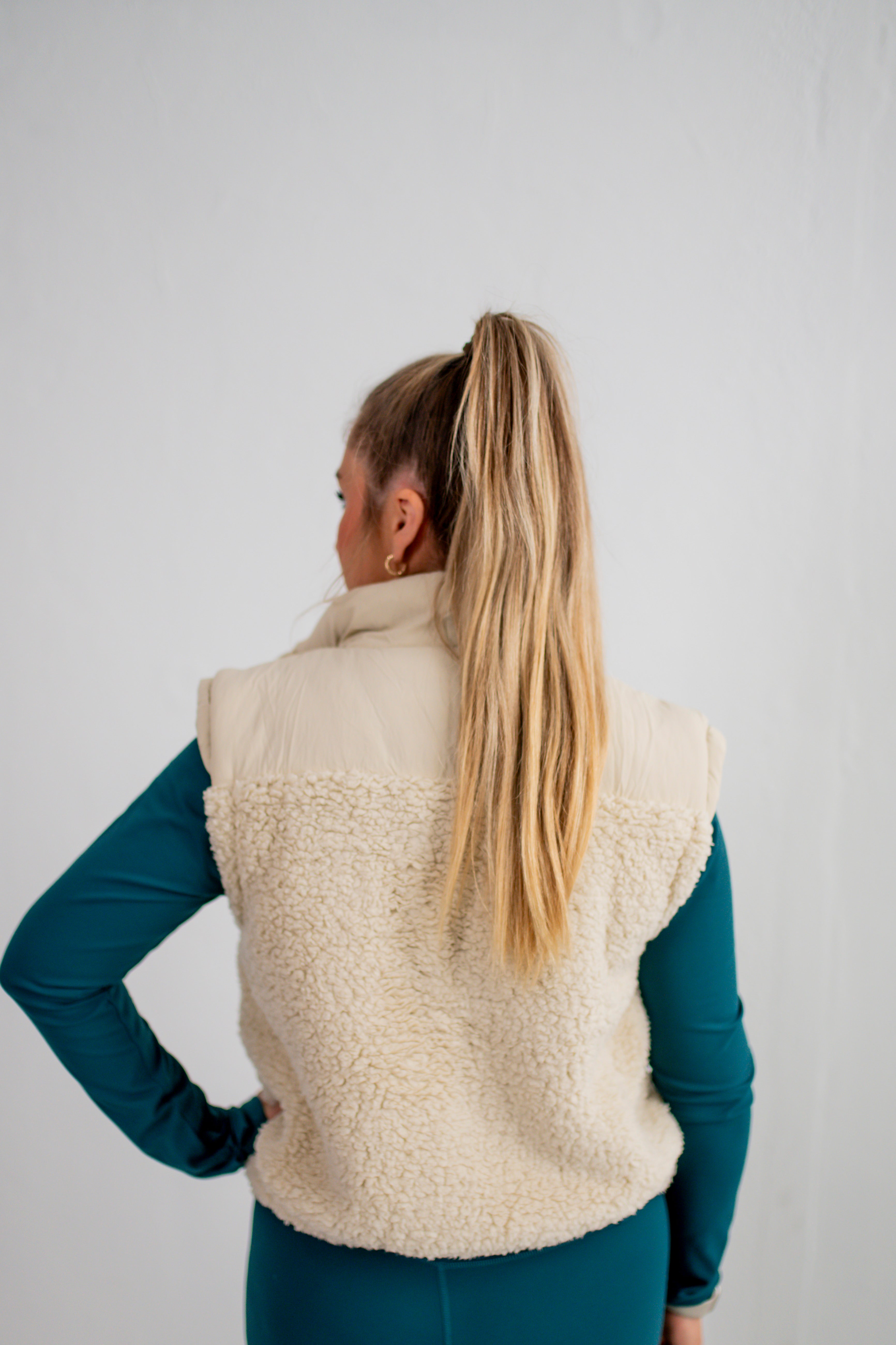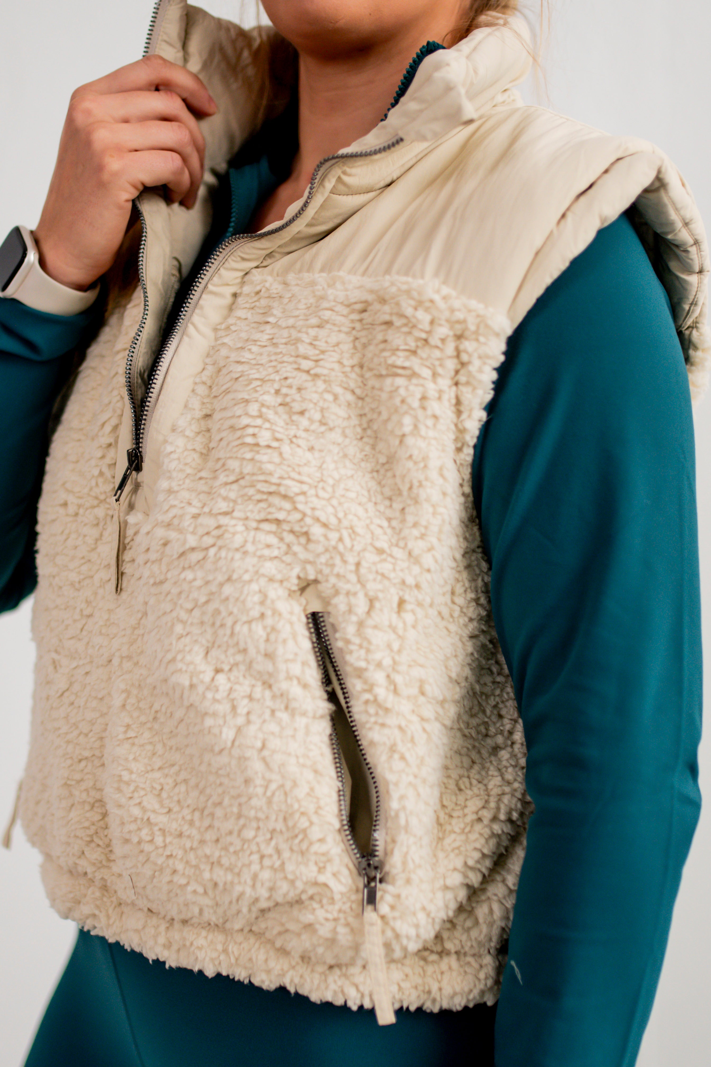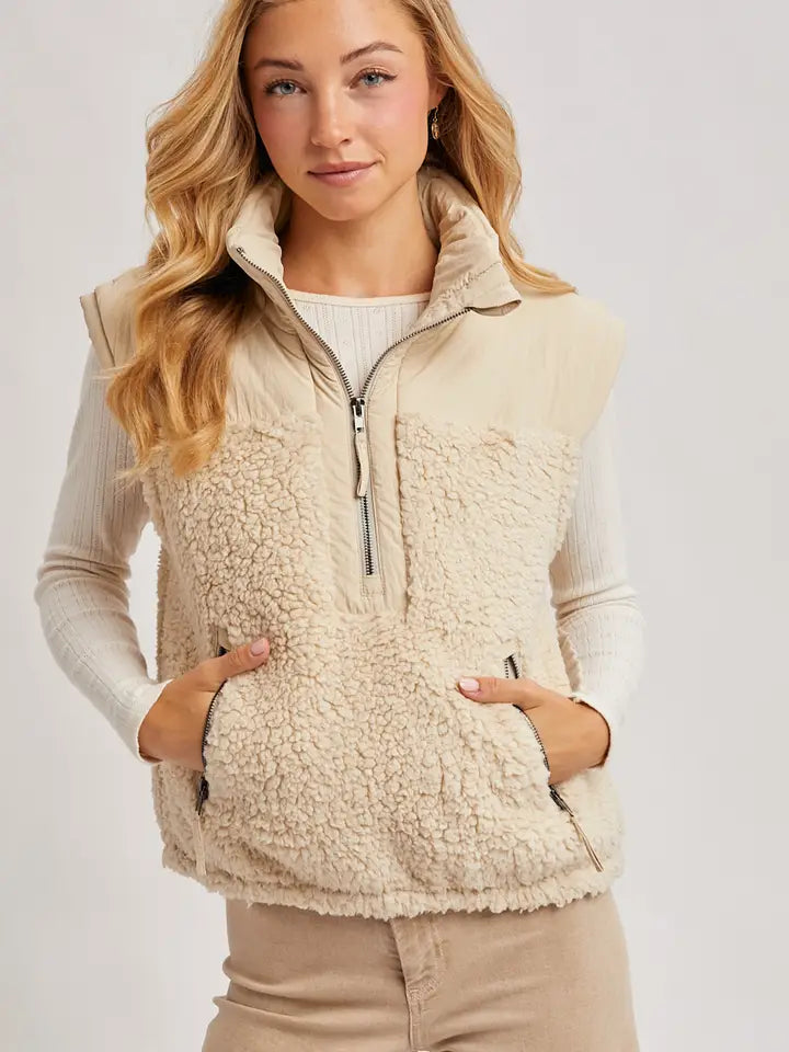 Sporty, outdoor-inspired style to your look with this cozy pullover vest. It features a unique mixed-media design, combining a plush, sherpa fleece body with a smooth, nylon yoke and a protective high stand collar. The practical half-zip closure allows for easy wear, and a side pockets offers a convenient place to warm your hands. This versatile vest is the perfect layering piece for fall adventures, easily worn over your favorite long-sleeve tops.