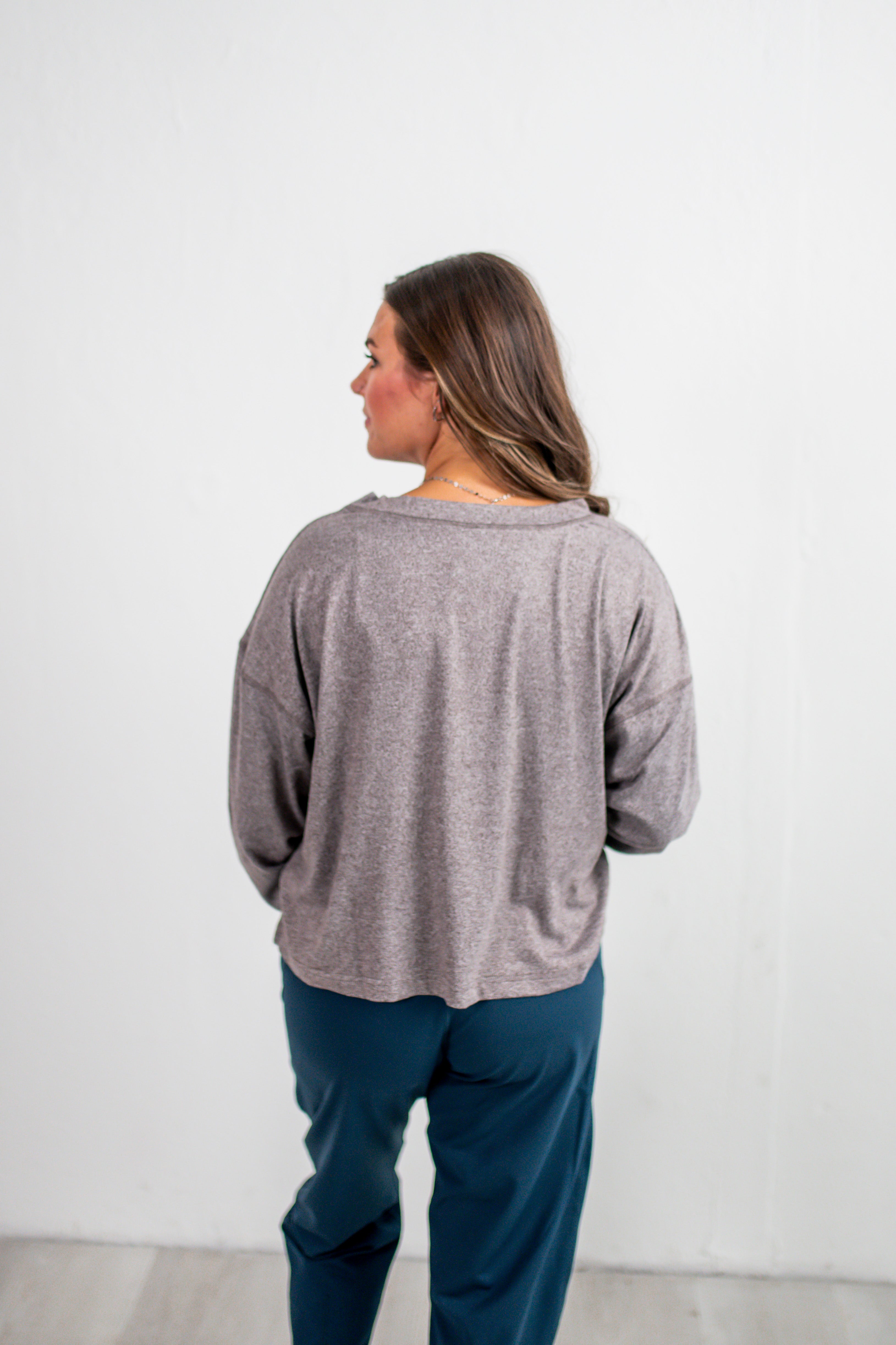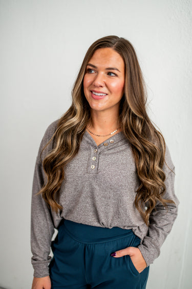 Espresso Brushed Hacci Lounge V Neck Buttoned Long Sleeve