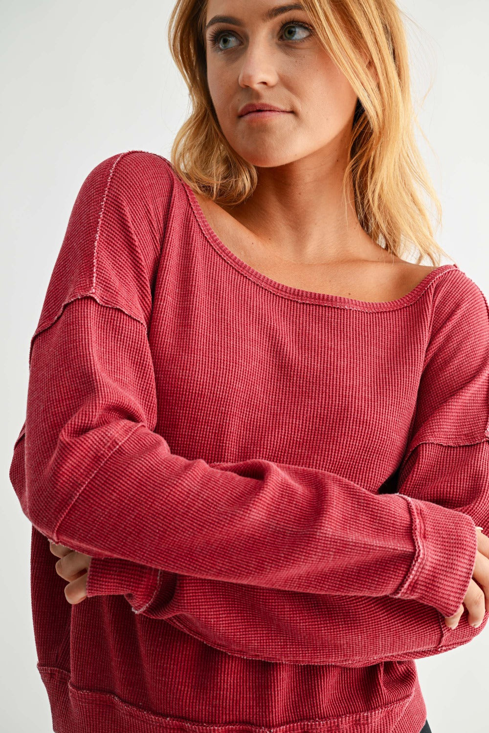 Garnet Red Raw Edge Waffle Knit Boatneck Pullover