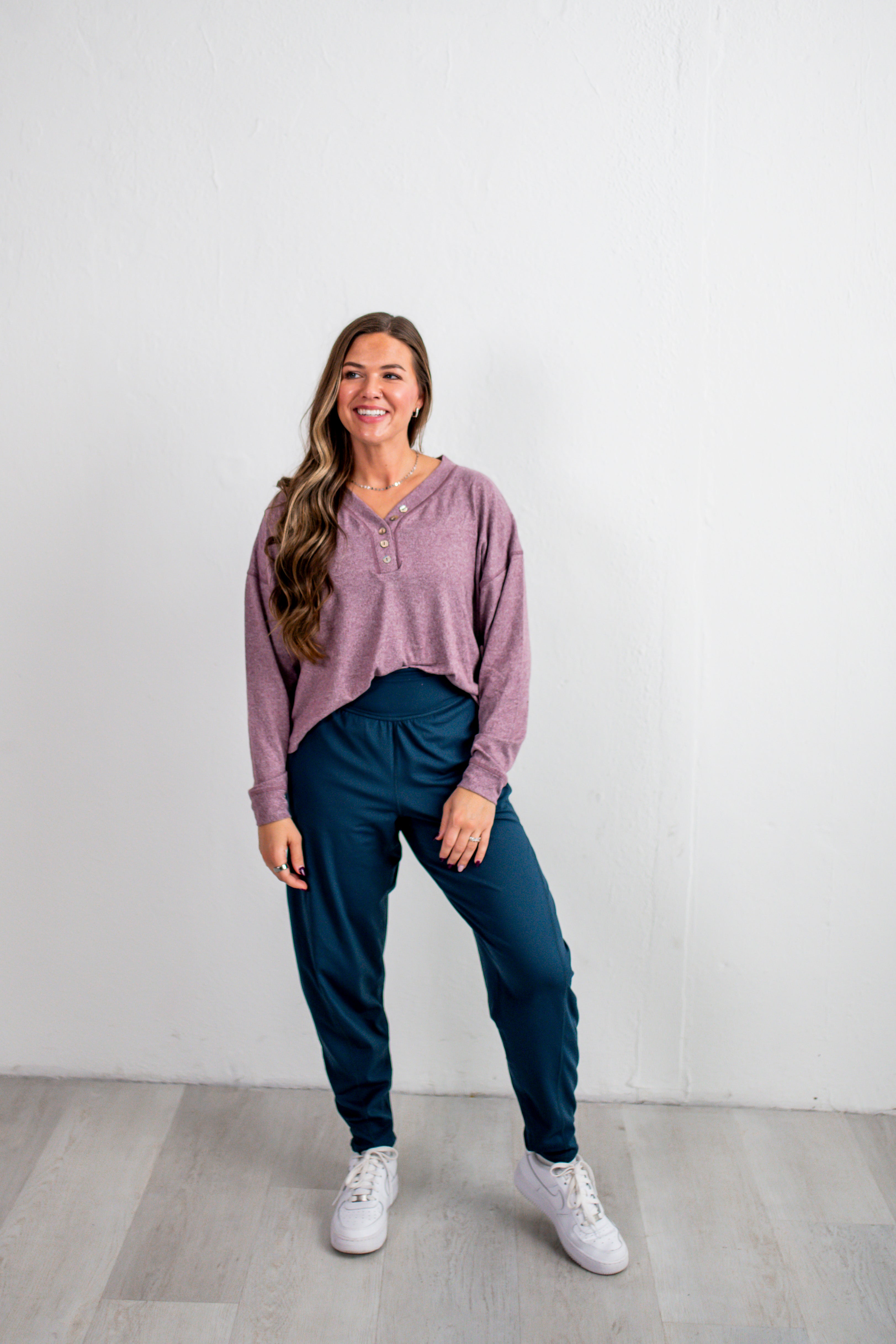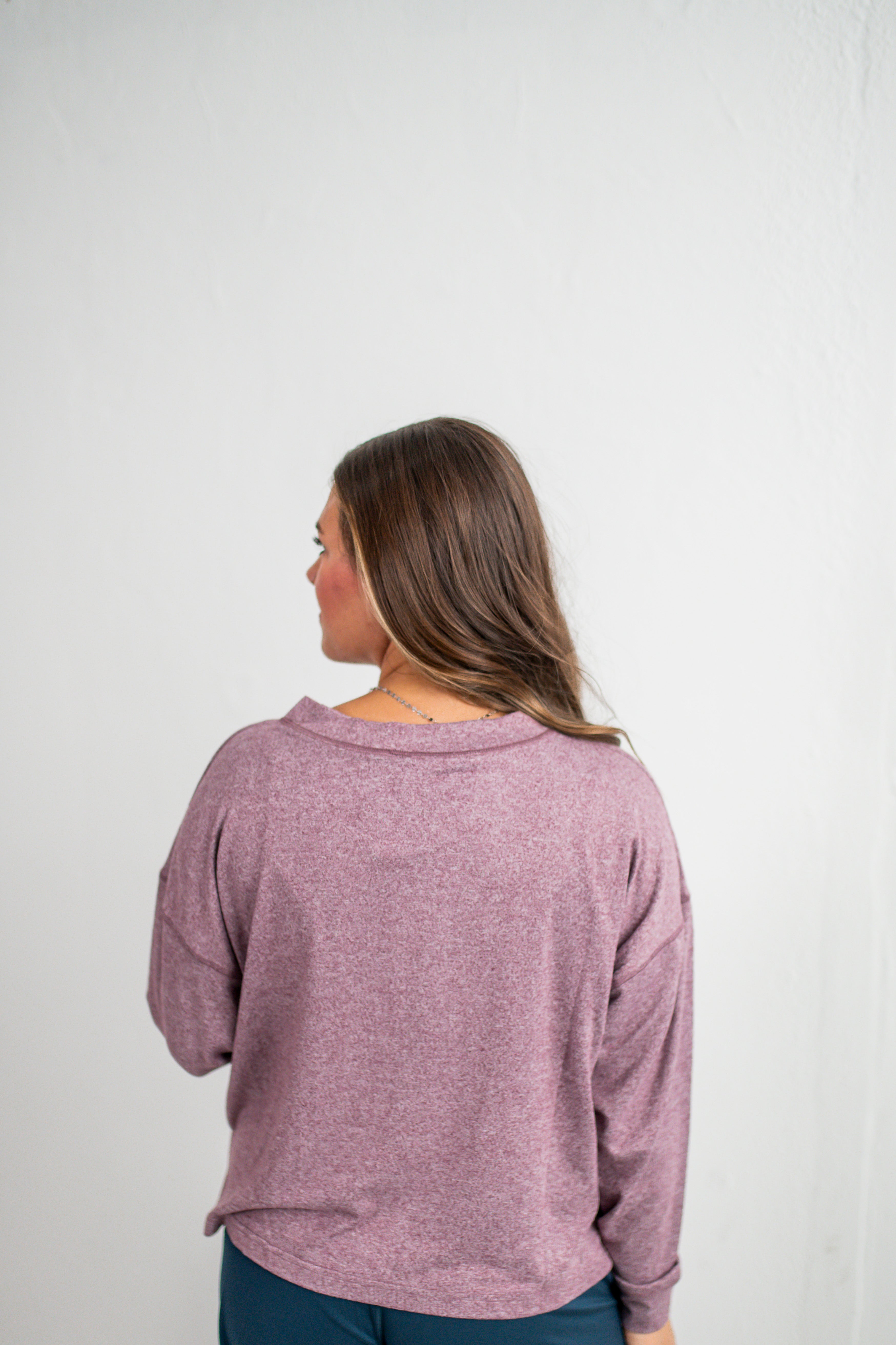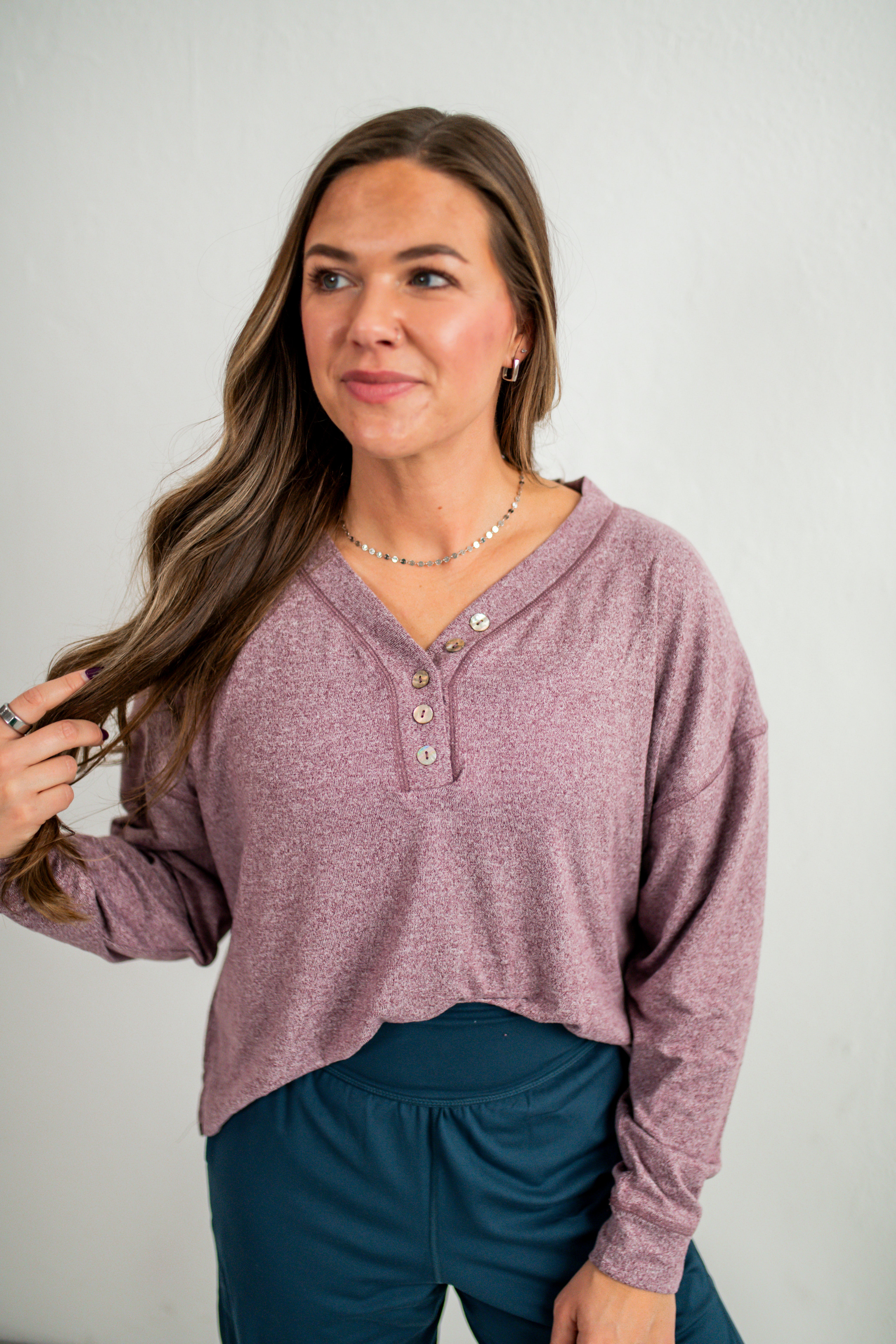 Heather Plum Brushed Hacci Lounge V Neck Buttoned Long Sleeve