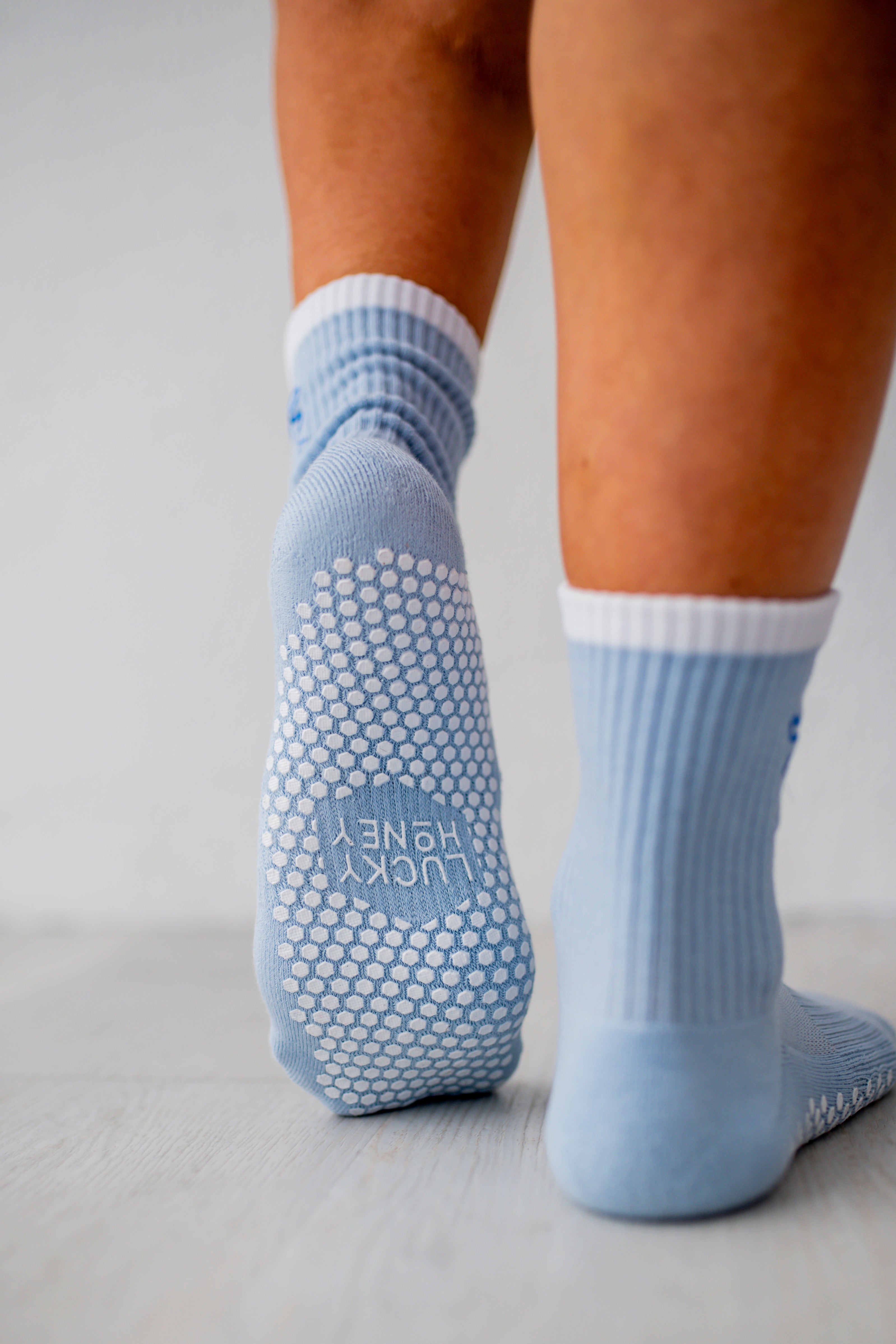 Introducing our chic crew grip sock collection, each pair adorned with the sweetest embroidered details. These socks are the perfect addition to your Pilates princess wardrobe—designed to move effortlessly from studio to street.