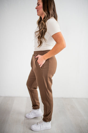 The perfect blend of cozy warmth and refined style. These medium-weight fleece joggers feature elastic cuffs and a smocked elastic waistband for a comfortable, secure fit. Designed with a self-panel running down the leg, they create a sleek, elongated silhouette that flatters your figure.